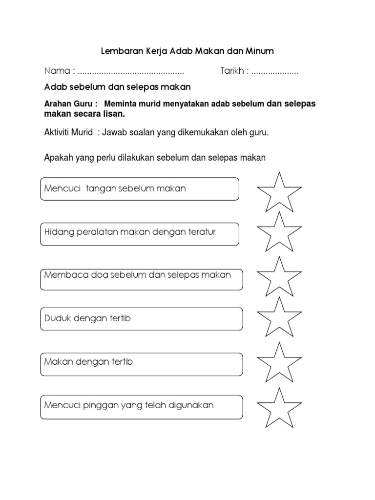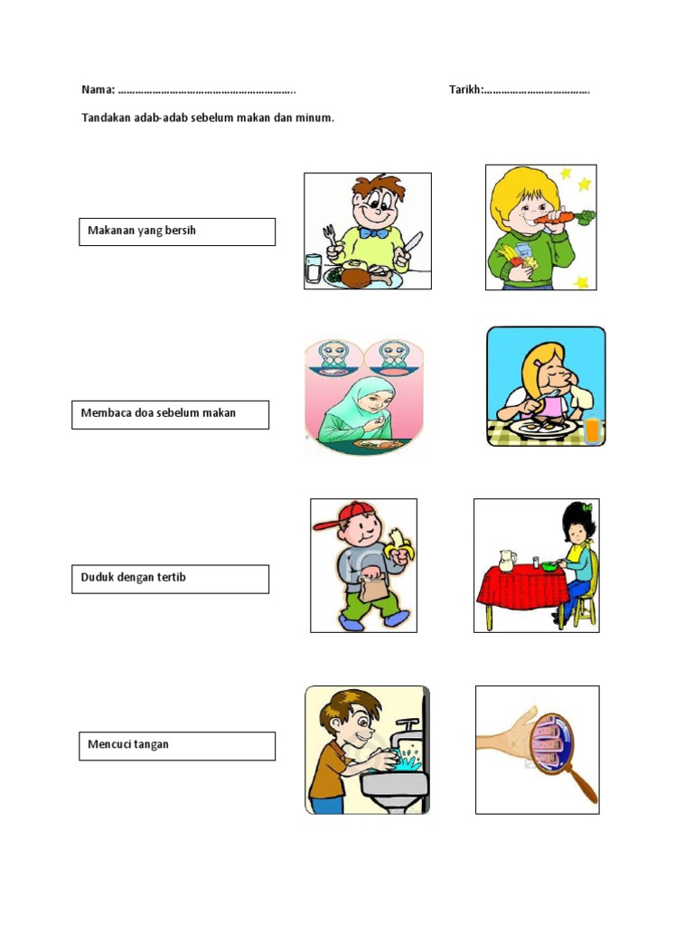 Contoh Lembaran Kerja Adab Makan Dan Minum. Mencuci tangan untuk menjaga kesehatan 4. Terangkan tentang sentuhan selamat dan sentuhan tidak selamat.